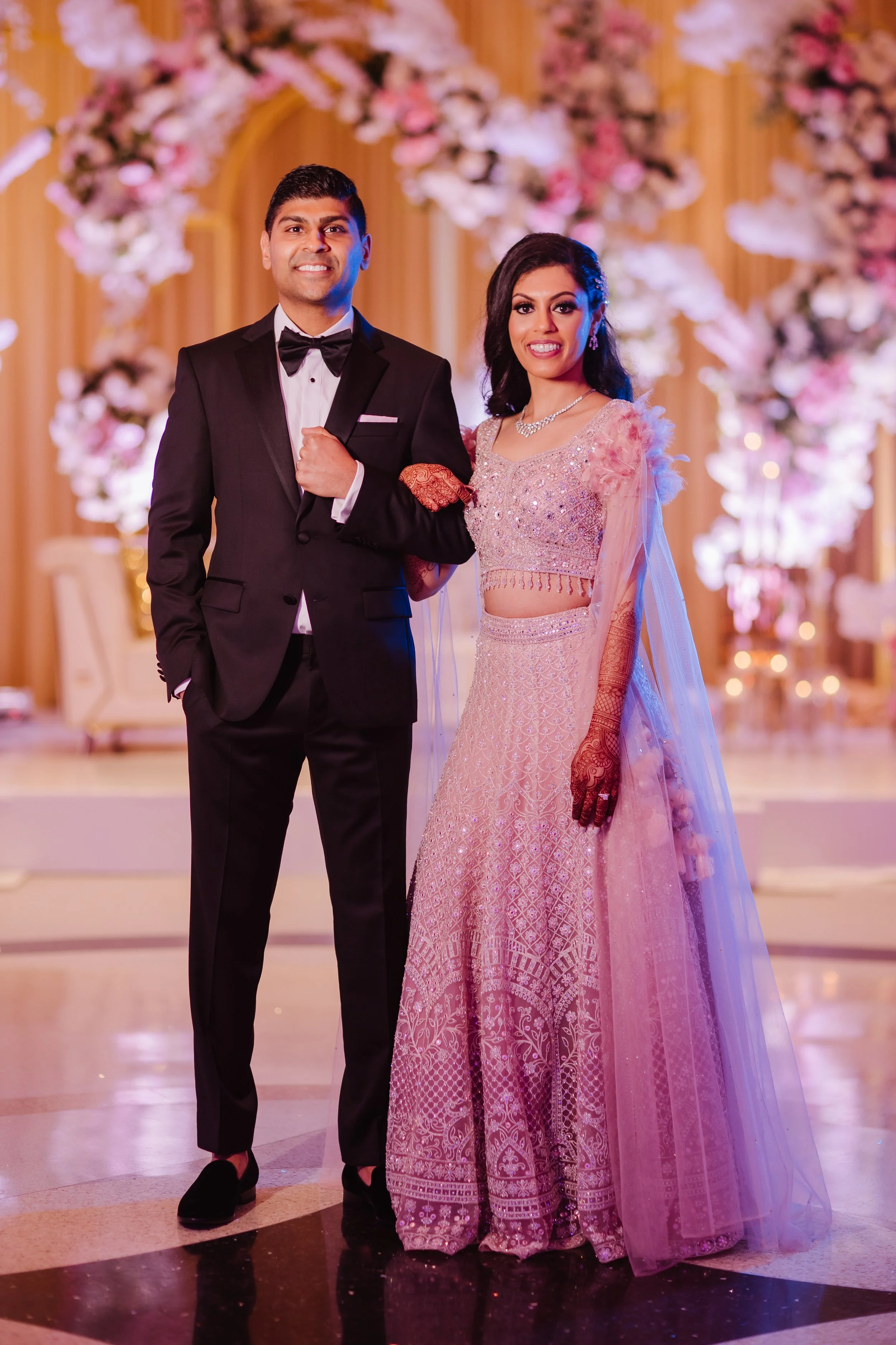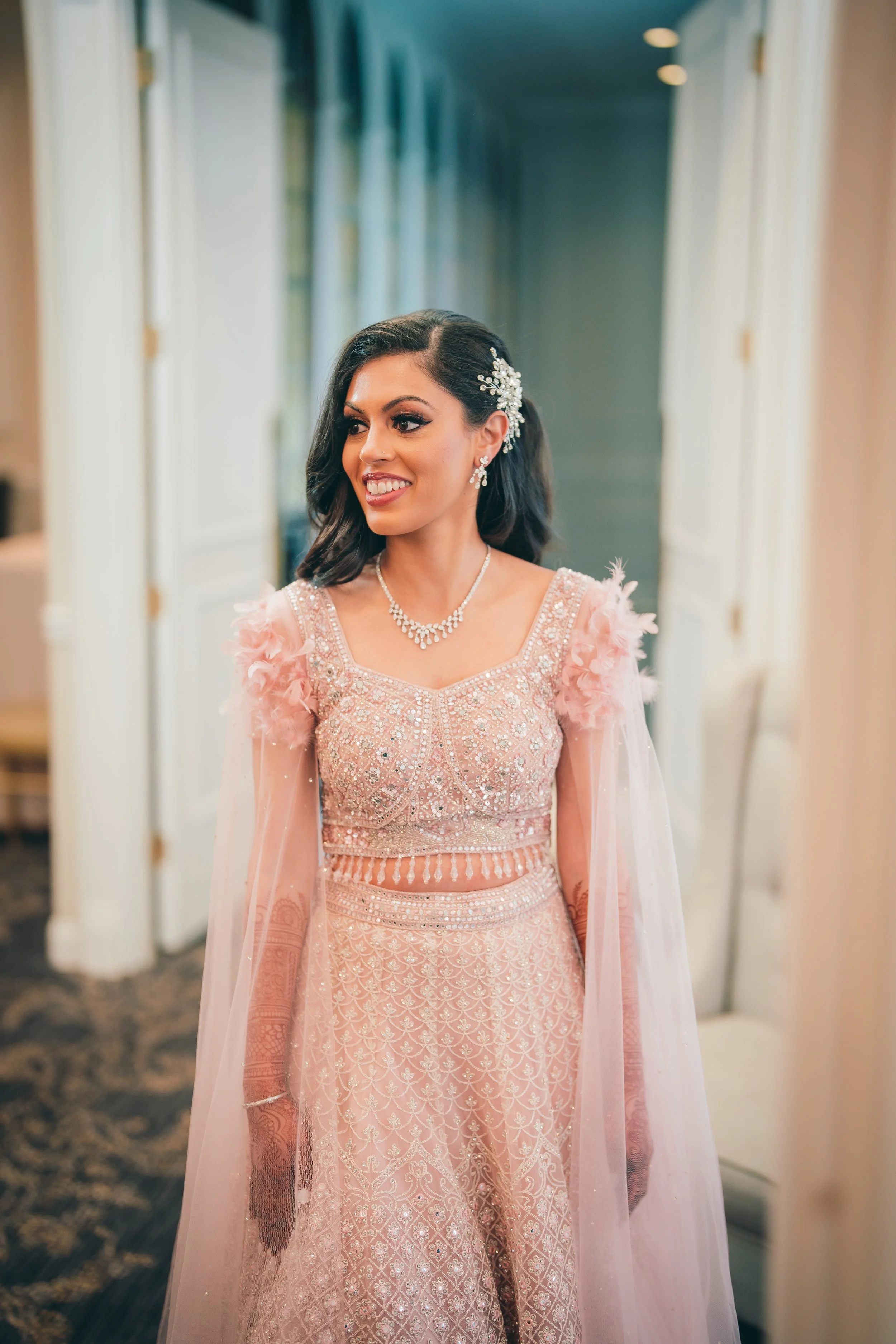 Megha chose a traditional, but soft glam, look for her wedding. She wore a beautiful red lehenga paired with green and gold jewelry. For her reception, she decided on a fully glamorous, elegant look! She wore a soft pink dress with matching silver jewelry.