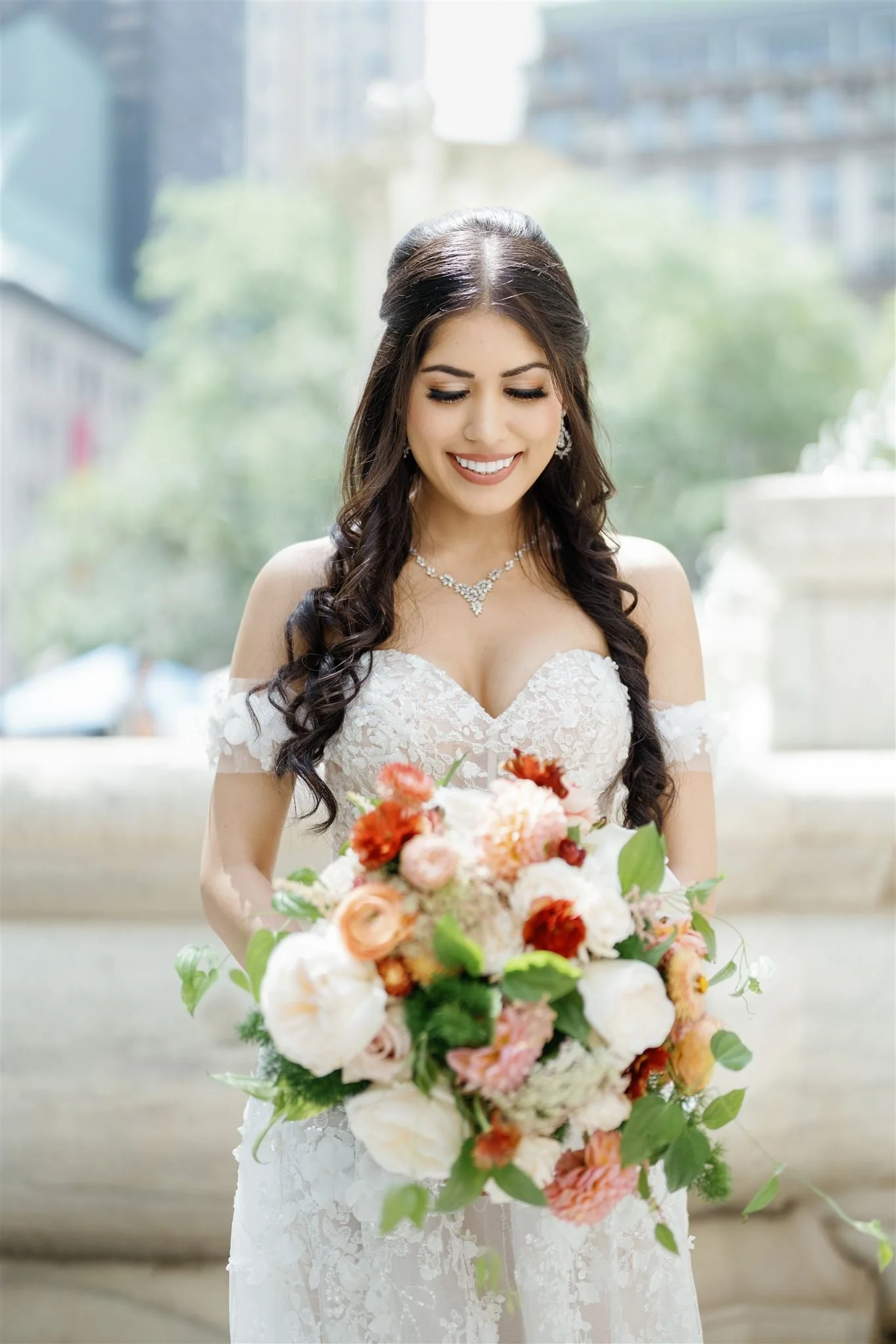 A half up - half down hairstyle is a great option if you want to leave your hair down, but also want it off your face. We love adding in a beautiful clip to pull your hair back so that it adds a little touch of glam to your hair! Add in some curls and this hairstyle is sure to elevate your stunning bridal look!