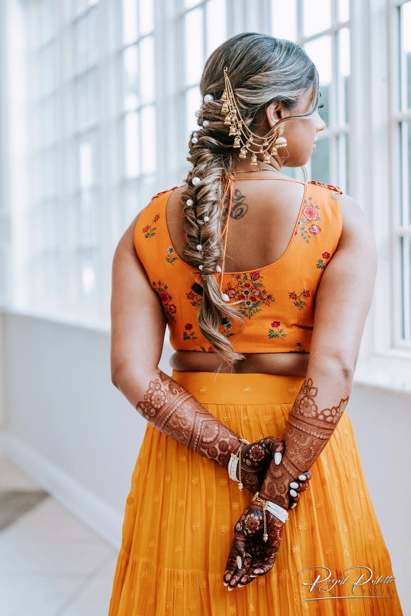 Choose floral hairpieces or gajras with butter yellow accents for a haldi or mehndi celebration.